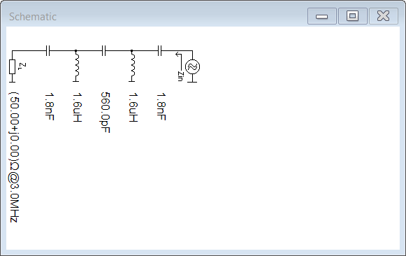 6. Kontrola propusti v nástroji Smith Chart od profesora Dellspergera. Nakreslíme si schéma propusti (viz vpravo) a ručně upravíme hodnoty použitých kapacit a indukčností. Pro kreslení jsem použil výchozí bod daný normovanou impedancí Z = 50 + j0 a kmitočtem f = 3 MHz. Z menu jsem si bral sériové kapacity a paralelní indukčnosti. Elementy vidíte vykreslené v diagramech (viz dole). Pokud se s tímto příkladem nechcete kreslit, můžete si soubor pro Smith chart stáhnout zde.