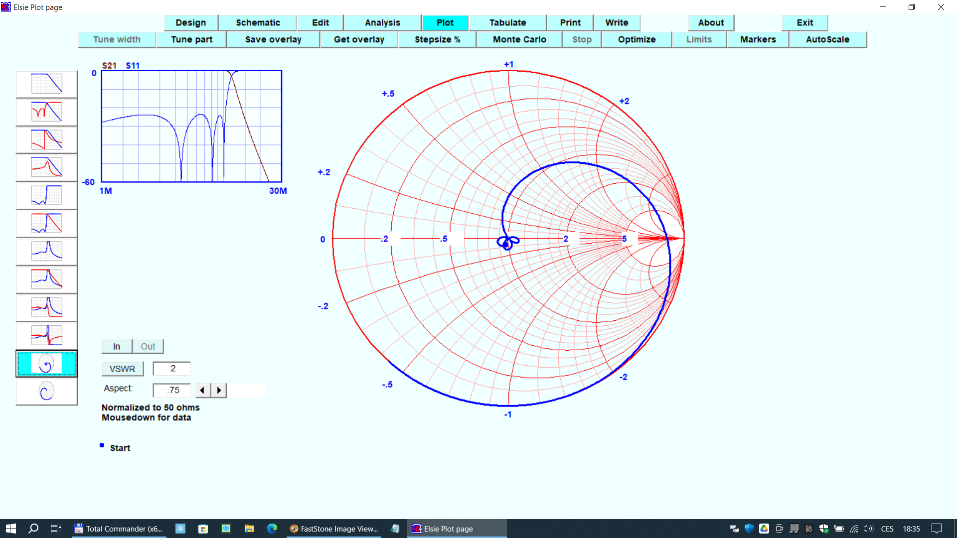2. vykreslení VSWR ve Smith Chart, abychom si mohli porovnat příslušné