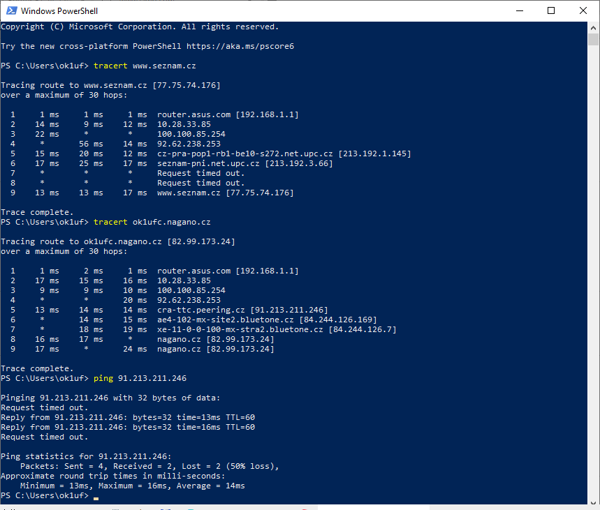 na IP gateway mého providera (delay 3 až 10 ms), vpravo tatáž