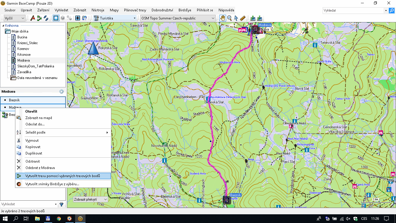 BaseCamp vygeneruje trasu ze dvou bodů. Níže vidíte (vlevo dole) selektované body Březník a Modrava. V kontextovém menu (pravé kliknutí) je příkaz vytvoř trasu s pomocí vybraných trasovýcg bodů: