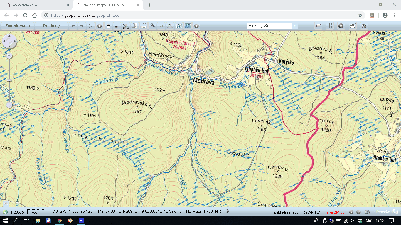 mají na serveru geoportal.cuzk.cz hezké topografické on-line mapy. Hezké znamená přehledné. Nepřeplácané zbytečnostmi. Mapy jsou vypracované profesionálními topografy. Používám si je pro tištění barevných papírových A4, které si občas nosím na výlety: