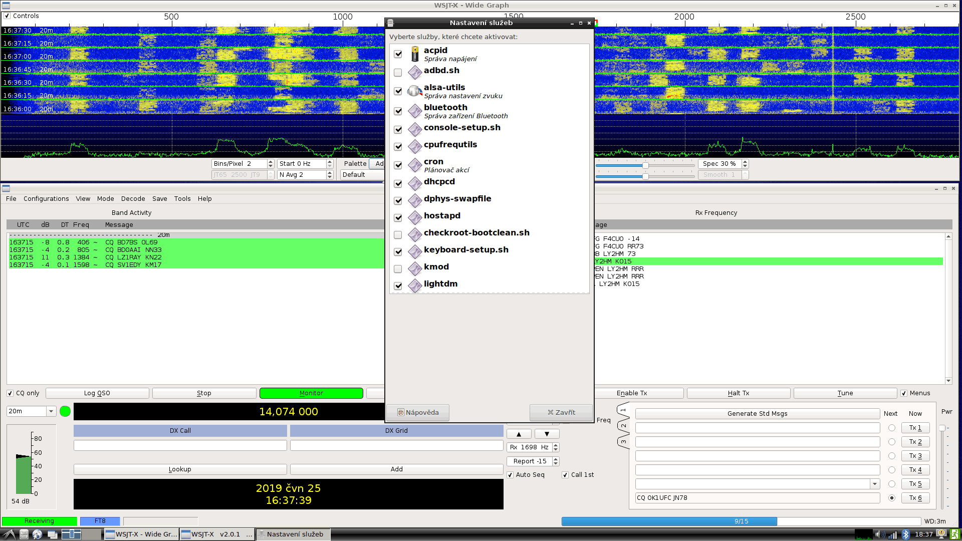 2. Druhý den jsem stáhnul balíček WSJTX, nastavil služby (hlavně alsa utils), časovou synchronizaci z NTP serverů.