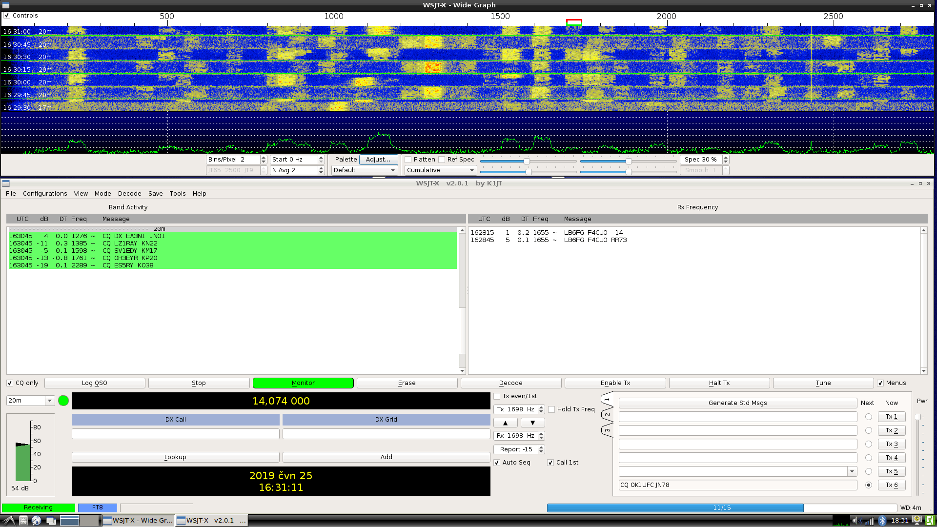 Další pomocný nebo nainstalovaný SW: DoubleCmd-qt (přenáším soubory na server), Gambas 3 (nesouvisí s WSJT), VLC přehrávač (asi nesouvisí s WSJT), Chromium browser (upload na eqsl)
