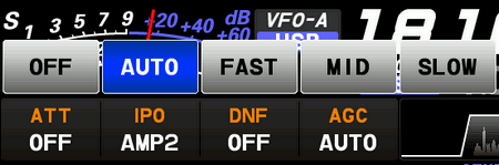 Například kliknutím na tlačítka ATT, IPO, DNF nebo AGC volíme nastavení atenuátoru IPO, dvou stupňů předzesilovačů, řídíme AGC, atd.
