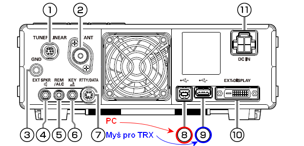 Dále je TRX vybaven druhým rozhraním USB (typ A), ke kterému lze připojit myš a/nebo klávesnici. Na obrázku vpravo označeno číslicí 9. Po připojení myši se na obrazovce displeje transceiveru objeví malý kurzor ve tvaru šipky, kterým lze přesně ukázat na jednotlivé ovládací prvky menu a kliknutím provést požadovanou akci. Pro toho, kdo je zvyklý na přesnou práci s PC, pro toho, kdo nechce řešit, zda má nebo nemá silnější prst a opravdu ho nebere dotykový displej, použití myši vřele doporučuji. Jde o přesné ukazování (polohování), po kliknutí následuje okamžitá reakce. Na displej nemusíte sáhnout. Parádička.