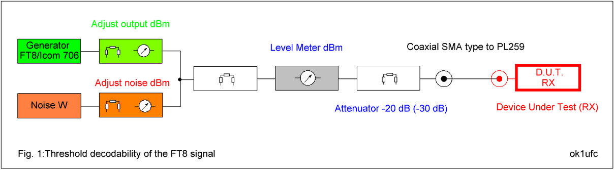 Signál FT8 i signál z šumového generátoru lze mísit na atenuátorech a