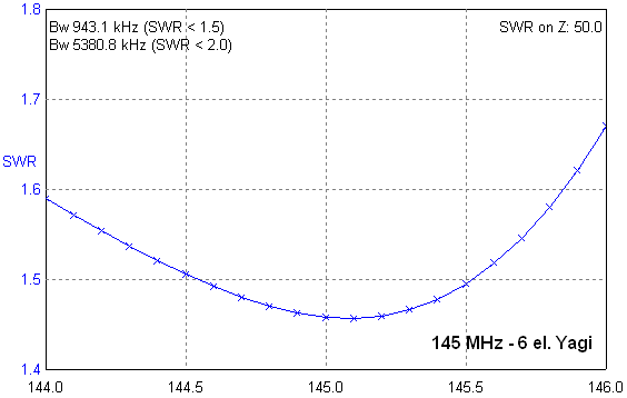 Vyzařování antény odpovídá jejímu modelu NEC. Nemám zkušenosti s optimalizací VHF antén. Proto mě shoda změřených proudů v elementech a shoda změřených impedancí s vypočtenými hodnotami u velice jednoduchého modelu překvapila. Zisk antény se bude pohybovat někde kolem 9 až 10 dBd a činitel zpětného příjmu někde mezi 13 až 15 dB. Nevím, jak je na tom známá 4Y podle OK1KRC, také jsem ji měl, ale tato 6 prvková byla kdysi při satelitním provozu VO-52 znatelně lepší.