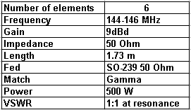 Všechny důležité parametry antény a geometrické rozměry jsou uvedené v následujících tabulkách. Kapacita v Gamma Match je vyrobena z vnitřního vodiče a dielektrika koaxiálního kabelu. Anténu jde na potřebném kmitočtu přizpůsobit na VSWR 1:1 až 1:1.2 při rezonanci. Délka trubky Gamma match je 240 mm (měřeno od středu ráhna na konec trubky). Vnější průměr trubky Gamma match je 9 mm.