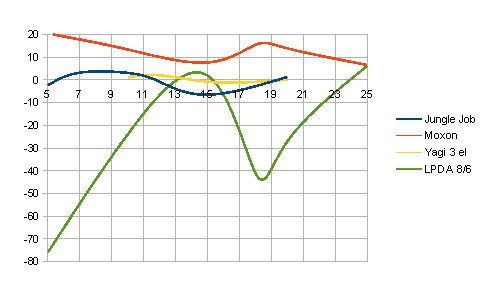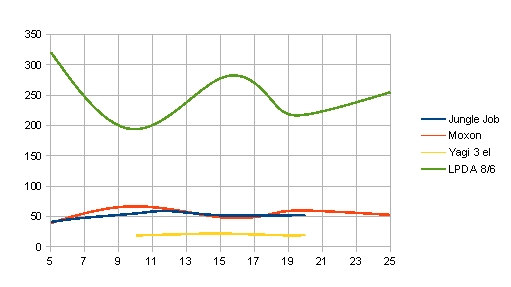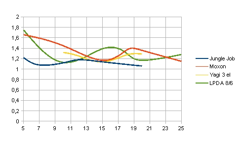 návrhové výšce H. A to je výhodné. Průběhy SWR u konkrétních typů směrových antén Jak se chovají různé antény v různých výškách? Na dalších grafech uvádím průběhy čtyř antén. Jde o Jungle-Job (vynikající dvouprvková jednopásmová anténa, driven element je v plné délce, reflektor je ve tvaru V), MOXON, tříprvkovou Yagi (navržena na impedanci 25 Ohmů) a logaritmicko-periodické pole dipólů LPDA ( 8 prvků a délka ráhna 5.9 m). Úmyslně jsem zde vynechal dvě antény - vícepásmovou yagi s proloženými prvky a hex-beam. O těchto anténách napíšu jindy. A omlouvám se za stupnici SWR v grafu. Hloupý SW na malování grafů nepoznal, že jde o SWR, hi a já si toho všiml pozdě...Všechny antény nebyly měřeny ve všech výškách, měření se dělalo pro h = 5m, 7m, 10m, 12m, 15m, 20m a u LPDA a MOXON také v 25m. Yagi nebyla měřena v 5m a 7m.