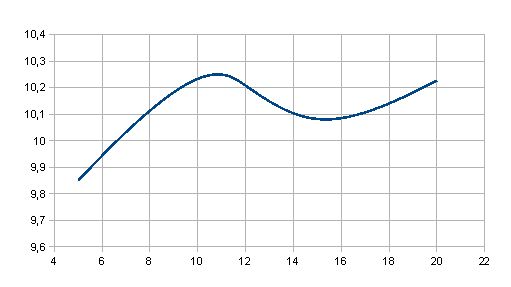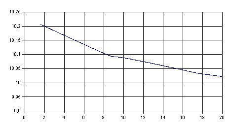 Z grafů vidíme, že reálná a jalová složka impedance se u antény monoband Yagi "plazí" kolem jmenovitých hodnot. A totéž lze přiměřeně říci i o anténě Jungle Job. A také je vidět, jak se v dané situaci chová LPDA. Je to dáno principem její činnosti. Podrobnějšími rozbory bychom zjistili, že u antén LPDA mají v uvažovaném pásmu na průběh SWR v návrhové výšce vliv parametry TAU a SIGMA. Chcete-li to říci jinak, pak tedy design antény, tj. počet prvků a délka ráhna. Pokud byla pro pásmo 14-28 MHz anténa alespoň 8 prvková a ráhno dlouhé 5 metrů, bylo přizpůsobení OK. A s anténami o 4 prvcích jsem měl problémy, mimo směrového diagramu, také s přizpůsobením. Průběh SWR u osmiprvkové antény s délkou ráhna kolem 6 metrů na kmitočtech 14 až 28 MHz Kdo alespoň jednou nastavoval vícepásmovou anténu QUAD nebo Yagi s proloženými prvky (interlaced yagi) nebo 5 pásmový HEX-BEAM, ví, o čem je řeč. A zabere to i nějaký čas, pokud máme model NEC a aparaturu pro měření proudů. Ale existují i antény, které prostě nastavit nejdou. Tady se projeví základní výhoda LPDA antény. U popisu antény LPDA s 8 prvky a zde jsem uvedl také odkaz na program LPCAD 34. Pokud navrhneme LPDA anténu tímto programem, což není podmínkou nebo dodržíme geometrii s vyhovujícími parametry TAU a SIGMA při ručním výpočtu, který není složitý nebo pokud jednoduše okopírujeme nějakou důvěryhodnou konstrukci LPDA antény, obdržíme průběh SWR, který je uveden na grafu níže a anténa nám zcela určitě bude vyzařovat přibližně jako 2 prvková anténa Yagi. Bohudík, toto platí. Mnoha experimenty jsem to ověřil a antény, které jsem vyrobil a nesly označení MK1 (prvky šly regulovat ve velkém rozsahu) se tak chovaly. Tvrdím, že pouze tato skutečnost, tj. širokopásmovost, ještě vyhovující průběh SWR a prakticky nulové nastavování pro celý rozsah kmitočtů nás může oslnit. Určitě to však není spotřeba materiálu nebo zisk či F/B antény. Po výrobě s běžnou přesností se nám podaří docílit následujícího průběhu SWR, který naměříme: