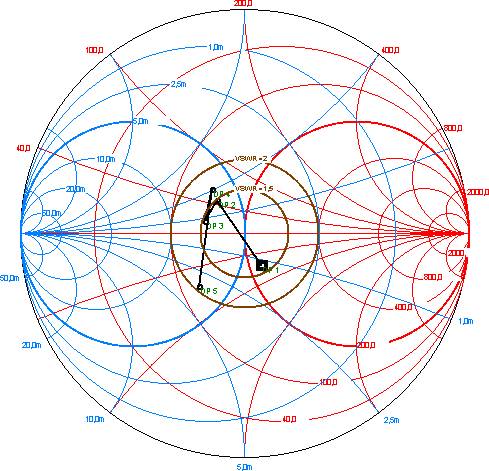 Vidíte, že to zcela určitě není špatné přizpůsobení. A proto se LPDA antény používají v profesionálních službách po celém světě. Průběhy impedancí u jedné z měřených VSVR ve Smithově diagramu: