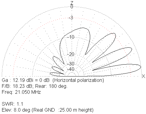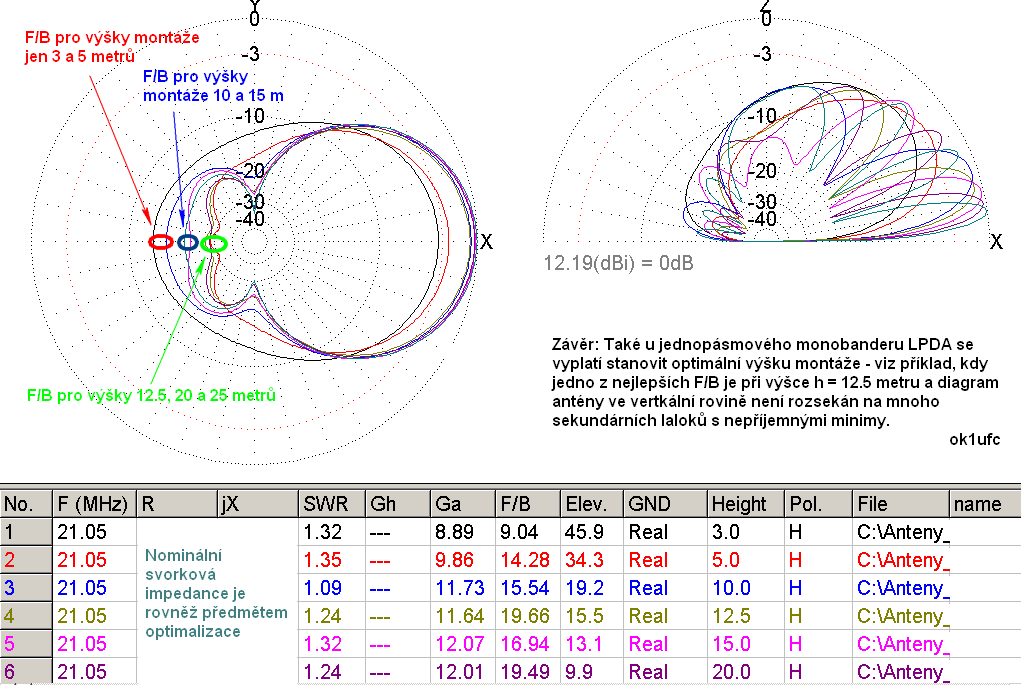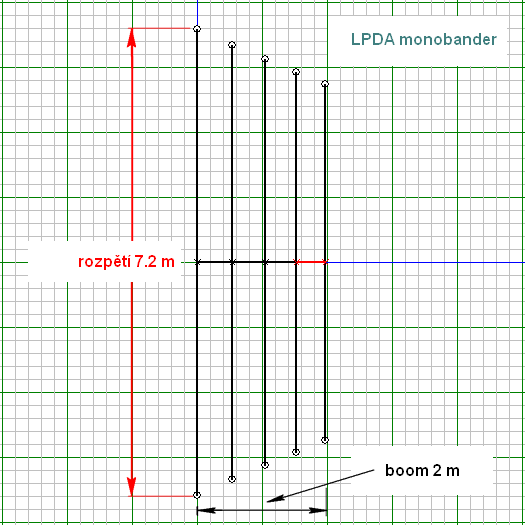 Pro naši úvahu byl použit monobander s 5 LP dipóly na ráhně dlouhém jen