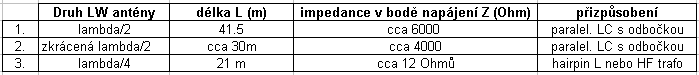Rozdíly u jednotlivých antén vystihuje tato tabulka 1. Všimněte si, že