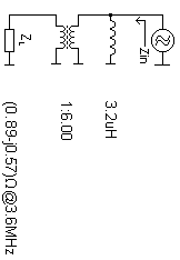 Vlevo je zakreslen bod zeleného kolečka (0.8866-j0.5474). Do bodu TP2 vede delší zelený oblouk. Právě v tomto bodě odpovídá 8 závitům na toroidu. Kompenzaci nám dělá indukčnost trafa (kratší zelený oblouk ke středu) o hodnotě asi 3.2 mikroH. Schéma transformace je zde: