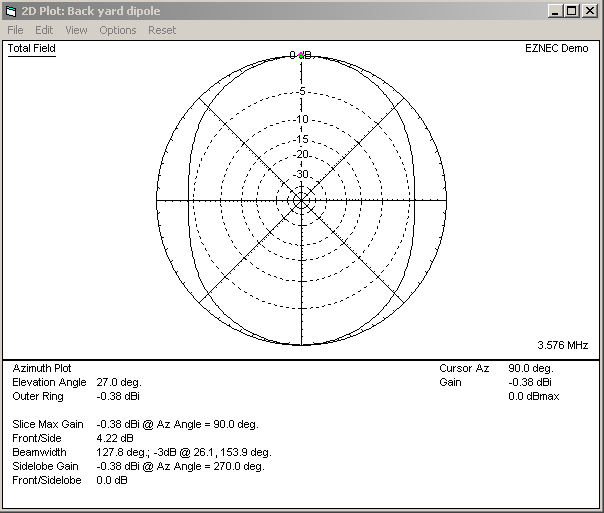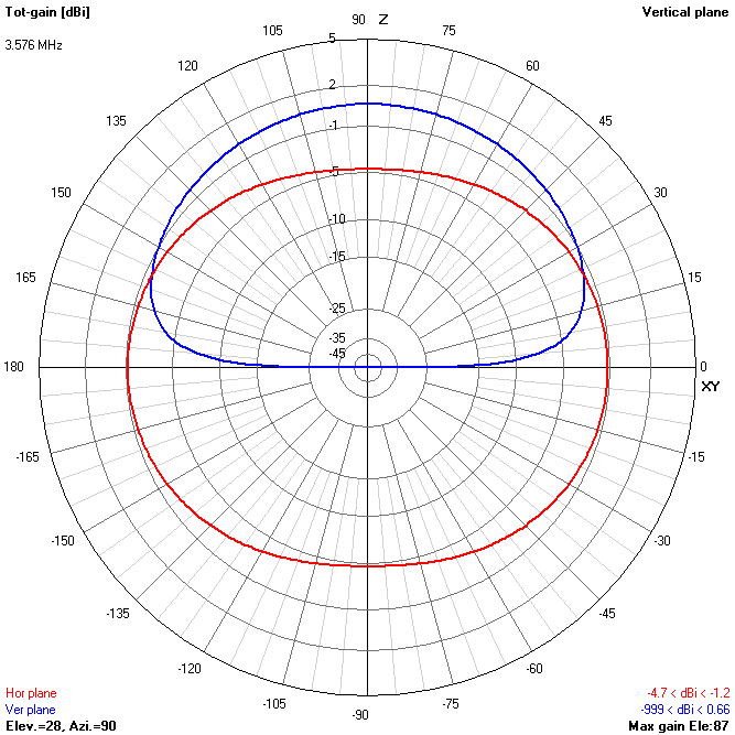 Výpočtem diagramů zjišťujeme, že anténa o obvodu asi 17 metrů bude slušným konkurentem vertikálům. Její zisk směrem k horizontu (na úhlu 27°) je asi -0.38 dBi. To není špatná hodnota. Vyřešením vyzařování v azimutu však vidíme, že diagram není všesměrový, ale je zploštělý a rozdíl mezi maximálním a minimálním vyzařování je asi 4.22 dB. Tuto hodnotu rozhodně nepodceníme a bereme ji v potaz při instalaci antény, kterou natočíme tak, aby maximum vyzařování bylo do žádaných směrů.