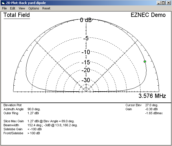 Popsaná anténa by měla mít některé vlastnosti srovnatelné s dobrým vertikálem. Výpočtem ověříme, zda to tak je. Vypočteme vyzařovací diagramy v elevaci i azimutu.