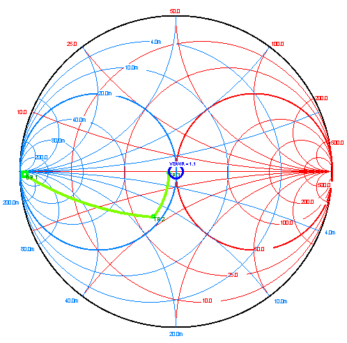 Z diagramu vidíme, že oblouček končí u kružnice VSWR=1.1 a to je asi tak nejlepší hodnota VSWR, které budeme dosahovat s uvedeným poměrem trafa, rozladěním antény a indukčností trafa. Dále bychom mohli přesně spočítat match loss ztráty, atd.