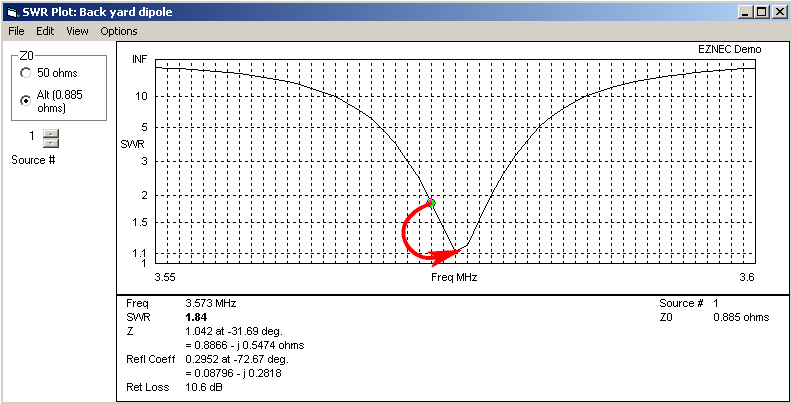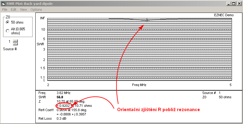 Na průběhu vidíme při Z=50 Ohmů nepatrný pokles VSWR, ale hlavně odečteme, že R je kolem tohoto bodu cca 0.92. Tuto hodnotu následně zadáme do programu jako Alt SWR Z0 (druhý řádek v menu odspodu).