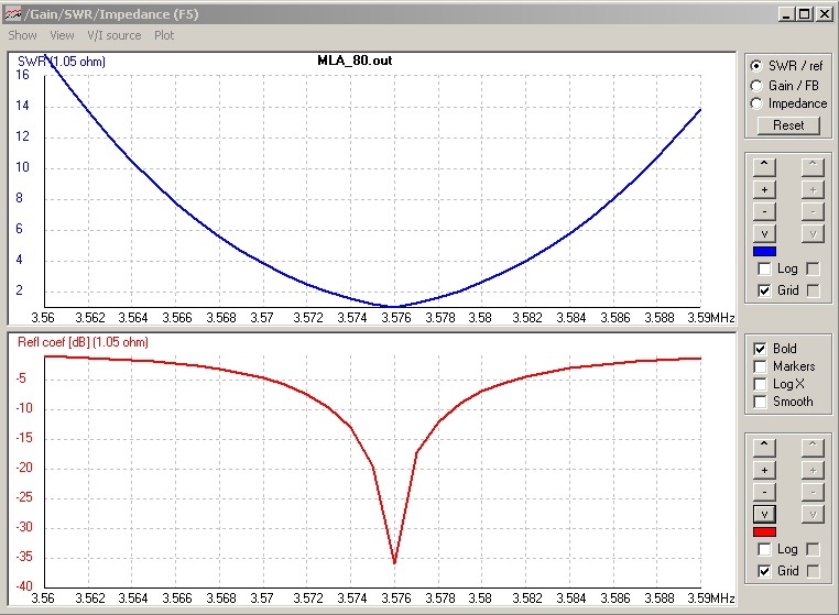 Všimněte si, že šířka pásma stanovená tímto způsobem je nepatrně větší. Je vyšší i impedance v bodě napájení (je 1.05 Ohmu proti 0.886 Ohmu)