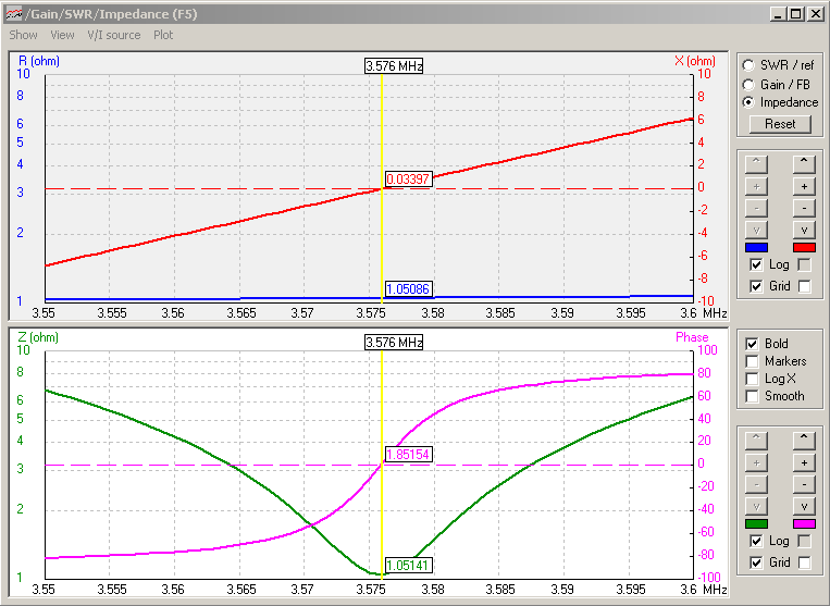 Spustíme program tlačítkem SWR tak, že nastavíme rozsah např. od 2 do 5 MHz. Vypočteme průběh VSWR a podíváme se, jaká je hodnota impedance poblíž rezonance: