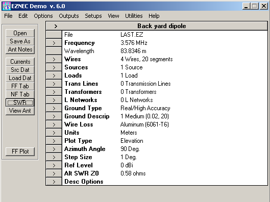Program EZNEC využívá enginu NEC-2. Jsou nastaveny tyto vlastnosti na úvodní obrazovce (tučný text), důležitá data jsou: frequency, wires, sources, loads, ground type, ground descrip, wire loss, units....