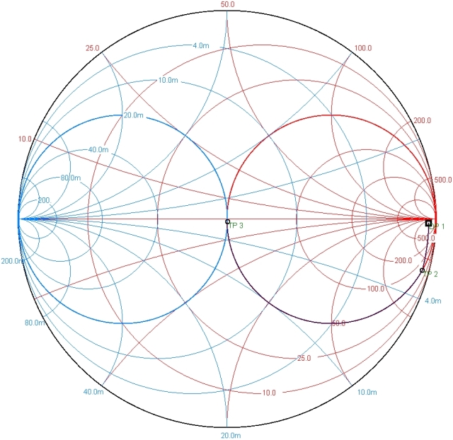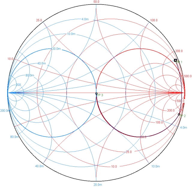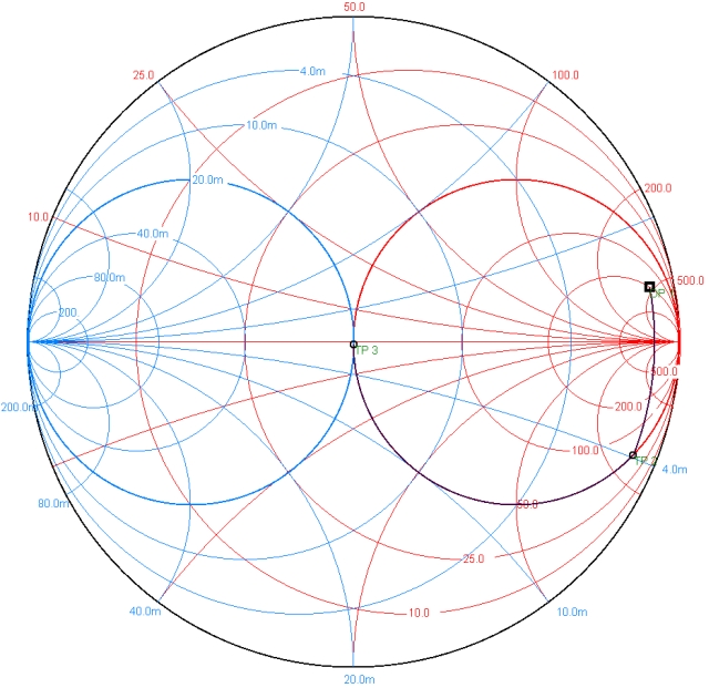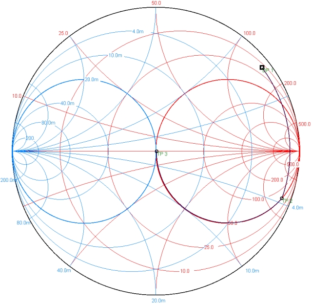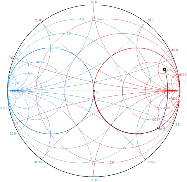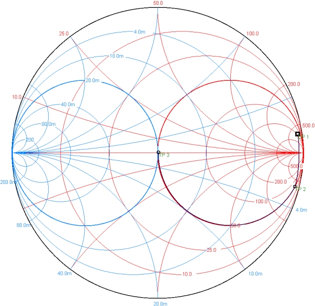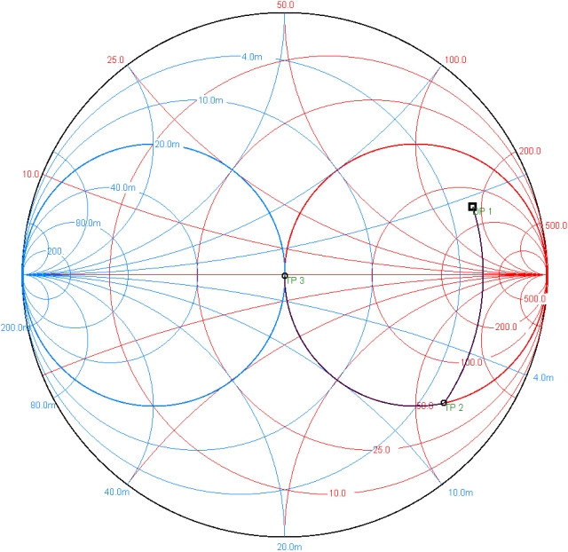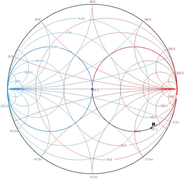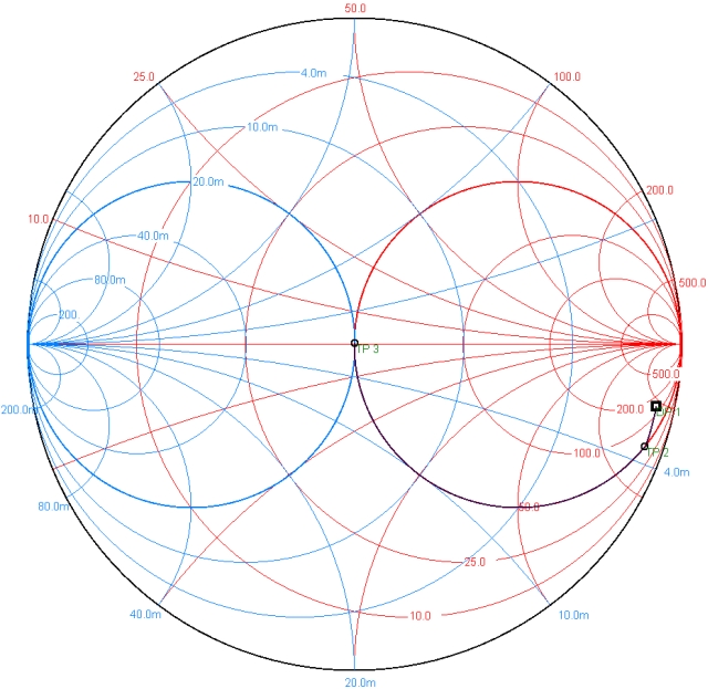 To, co je uvedeno na obrázku, je pravda. Jednoduchým L článkem uladíme bez přepínání právě jednu polovinu plochy Smithova diagramu. Takže ještě zbývá dodat, jak vypadá přizpůsobení naší PA0FRI ve Smithově diagramu. Diagramy pro všechna pásma jsou níže. Čtverečkem je označen DP1 (datapoint1 s impedancí antény na daném kmitočtu), černými kružnicemi pak přizpůsobení L článkem, TP3 je vždy uprostřed diagramu, kde VSWR=1: