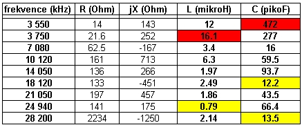 Schéma budeme číst zleva. Anténa PA0FRI měla na kmitočtu 3 750 kHz reálnou složku R=21.6 Ohmu a jalovou jX=252 Ohmů. K charakteristické impedanci koaxiálu Z=50 Ohmů byla přizpůsobena L článkem s kapacitou C=276 pF a indukčností L= 16.2 mikroH. Toto schéma ladění platilo pro anténu instalovanou jako INV V, kde střed antény byl vytažen kladkou do výše h=11m a konce zářiče byly ve výšce asi 4.5 metru. Žebříček byl dlouhý přesně 10 metrů a byl realizován symetrickým vedením PCV-570-84. Na jiných pásmech a kmitočtech byl použit stejný typ L článku. To znamená, že nebylo třeba přepínat na žádném pásmu kapacitu před nebo za indukčnost. Velikosti R, jX a potřebných kapacit a indukčností uvádím pro všechna pásma v tabulce zde: