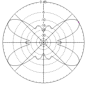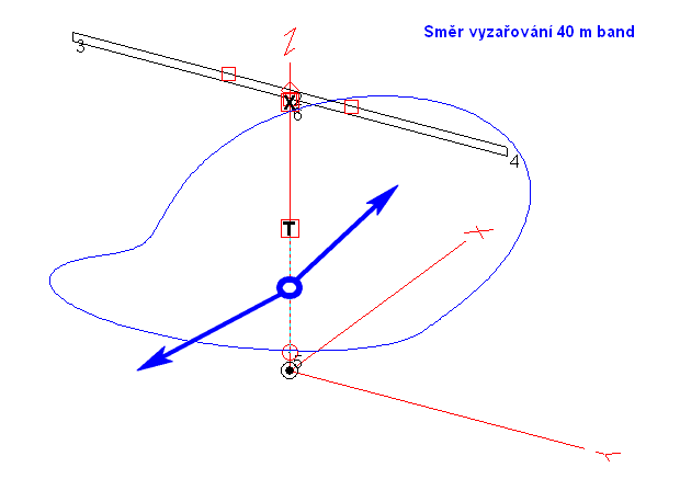 Přestože jsem anténu vyzkoušel v různých konfiguracích, zaujala mě především jako horizontálně instalovaná. Při horizontální montáži má anténa bidirektivní vyzařovací diagram. Např. dále popisovaná anténa vyzařuje takto. Obrázek znázorňuje anténu dlouhou 25 metrů nad reálnou zemí, ve výšce 15 metrů. Modrá čára je čára vyzařovacího diagramu, znázorněna jako mírně zvednutá nad horizont.