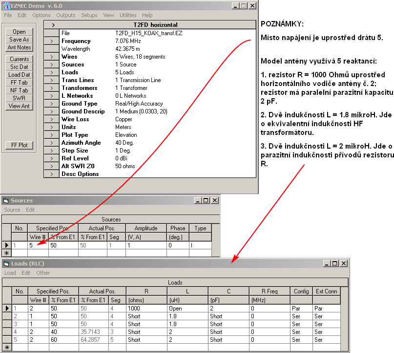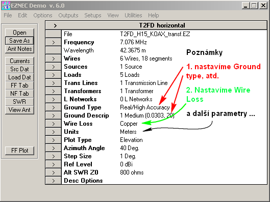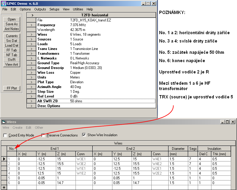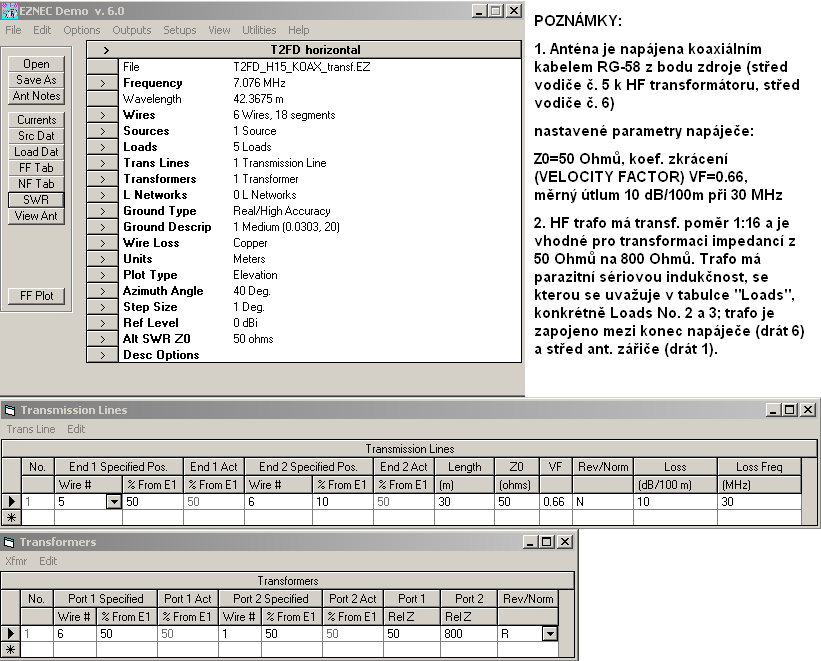 a také soubor pro EZNEC ke stažení zde: T2FD_H15_KOAX_transf.EZ