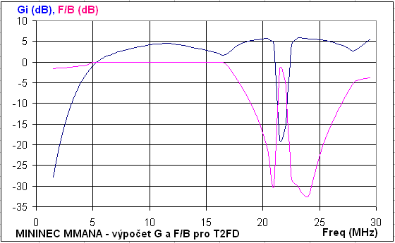 Obdobně jsem vypočítal také hodnoty G (dBi) a F/B. Graf je níže. Všimněte si, že zisk, který je v pásmu 160m téměř -30 dB, strmě stoupá. Na pásmu 80m se obě metody výpočtu shodnou na hodnotách kolem -8 dBi. Nad 5 MHz jsou již hodnoty pozitivní. Všimněte si anomální resonance kolem 21 MHz. Občas se divíme, proč se nám širokopásmová anténa na nějaké frekvenci divně chová ....