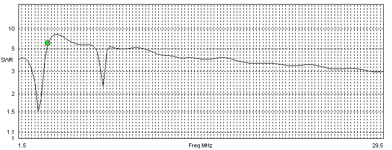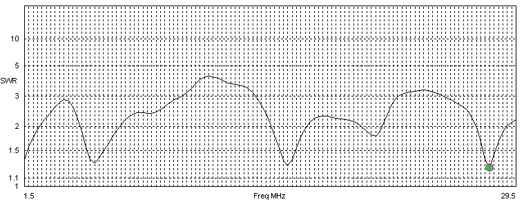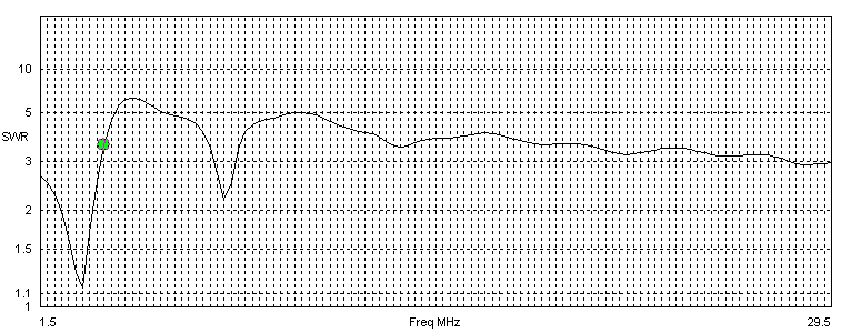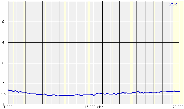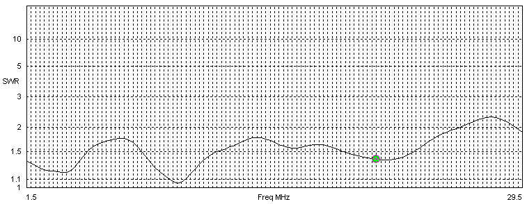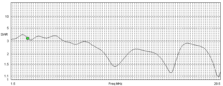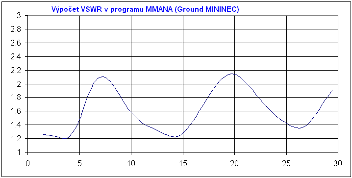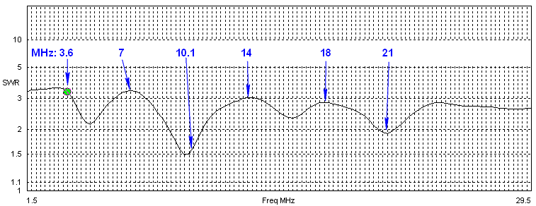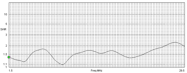 Dobře navržená anténa má velmi příznivý průběh VSWR ve velkém rozsahu kmitočtů. Např. hodnoty VSWR  menší než 3 lze realizovat v kmitočtovém pásmu od 1.5 MHz do 30 MHz. Uvádím reálný příklad průběhu VSWR, instalace ve výšce 15 metrů: