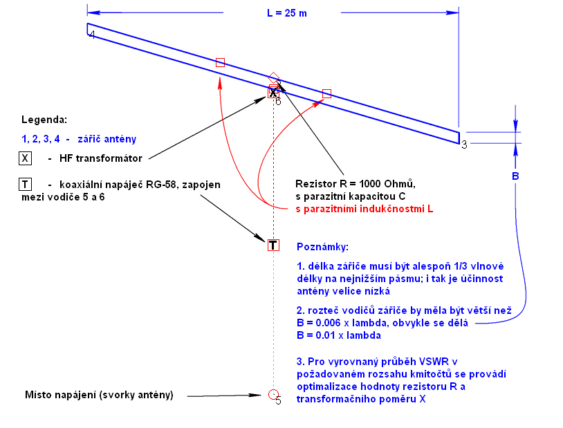 Po zadání dat můžeme počítat vlastnosti antény, nejen vyzařovací diagramy, ale díky enginu NEC-2 i poměrně přesně hodnoty impedancí, průběhy VSWR, atd. Můžeme také modelovat a optimalizovat potřebné parametry HF transformátoru. Optimalizace nás povede k vyšším poměrům X, ale zpět nás bude srážet ekvivalentní indukčnost trafa. Pro konkrétní transformační poměr zjistíme, že je velice důležitá hodnota terminace dipólu (odpor R). Také zjistíme, že u odporu nás zpět nebude až tak srážet požadavek na bezindukční provedení. Zjistíme, že vinutý odpor moc nefunguje, protože má jeho odporové vinutí opravdu "obrovskou" indukčnost v sérii s odporem. Jenže také zjistíme, že paralelní (nebo sériově-paralelní) řazení odporů opět nefunguje a tak se nám stane, že výsledek se nedostaví, protože taková terminace má velkou kapacitu mezi čely řady rezistorů. Anténa T2FD dává konstruktérům tak velký prostor v manipulaci s několika parametry, který vede k tomu, že jedni budou anténu chválit, druzí ji odsoudí, protože se jim nepovedlo těch pár parametrů vhodně zvolit a nastavit a třetí ji odsoudí rovnou, aniž by ji vyzkoušeli. Abychom byli v té první skupině, uvádím pro lepší orientaci na anténě ještě její schéma: