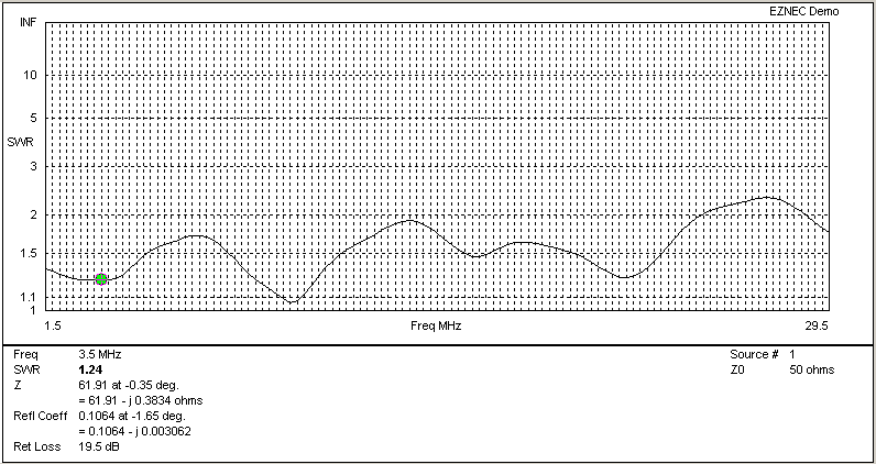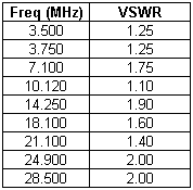 Průběh VSWR u modelované antény v celém rozsahu kmitočtů nepřekročil hodnotu VSWR = 2, viz tabulka vpravo a to je v poměrně slušné shodě s EZNEC modelem (demo verze, nízká segmentace).