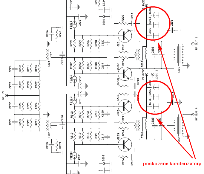 desku výkonového zesilovače. Zkrat vykazovala pouze jedna větev. Po