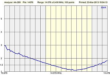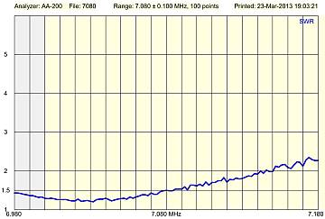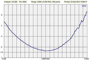 tak mě tato anténa doslova vypekla u zákazníka. Nevyhovující průběh VSWR v pásmu 40m. Mimochodem se do zakázky vloudila chyba, během výroby došlo k záměně výkresu zářiče, který byl "střižen" v nepříliš odlišných rozměrech. Nezbylo, než udělat u tak jednoduché antény opět celou řadu zkoušek a měření. K velkému překvapení se projevilo při některých montážích totéž, co u zmíněného zákazníka, objevily se nežádoucí průběhy VSWR v obou pásmech, způsobené montáží, ale také délkou použitého koaxiálního kabelu. Balun již nebyl schopen zabránit tomu, aby se napáječ nepodílel na vyzařování. Při nižších výškách tomu nezabránil ani ve vhodných výškách dodatečně vložený proudový balun, rovněž ani tlumivka z koaxiálního kabelu. Napáječ se podstatně podílel na vyzařování, naměřit se daly průběhy VSWR, které nebyly nijak v souladu s délkou zářiče, např na 5 MHz: