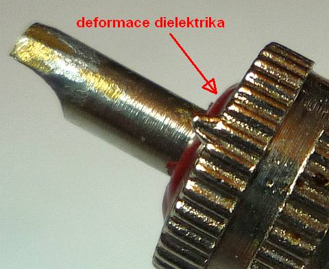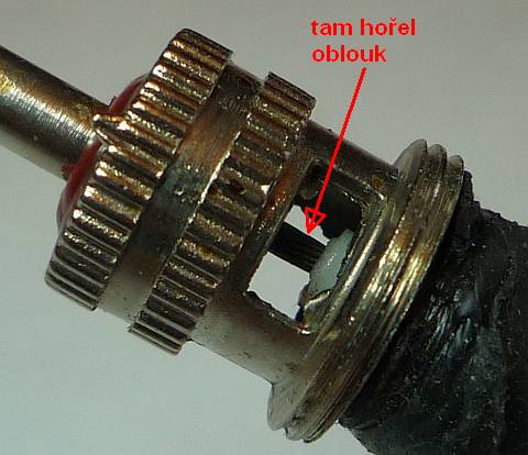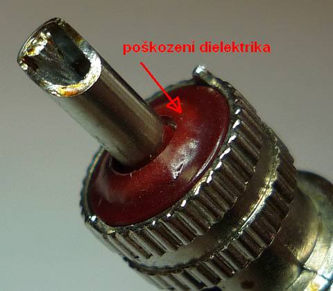 Skutečná příčina však vznikla uvnitř PL-259. Tam hořel oblouk při vysoké impedanci antény, původně ve vzduchové mezeře mezi středním vodičem a pláštěm, později volně, dielektrikum kabelu RG-58 už bylo roztaveno, ale teplo vznikalo dále, přenášelo se i přes kolík PL-259 do zásuvky SO-239 a zničilo dielektrika obou konektorů: