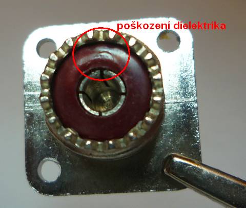 Tato zásuvka však nebyla poškozena "obrovským" proudem skrz konektor a není ani důsledkem nevyhovující elektrické pevnosti dielektrika. Příčina je jinde. Na konektoru SO-239 často "hoří oblouk" mezi vnitřním a vnějším vodičem. Pokud proti tomuto jevu ošetříme svorku na balunu, to jako výrobce vždy dělám, může stále ještě hořet oblouk na "samci" na koaxiálním kabelu. To se také stalo. Na obrázcích vidíte poškozenou zástrčku (Plug) PL-259: