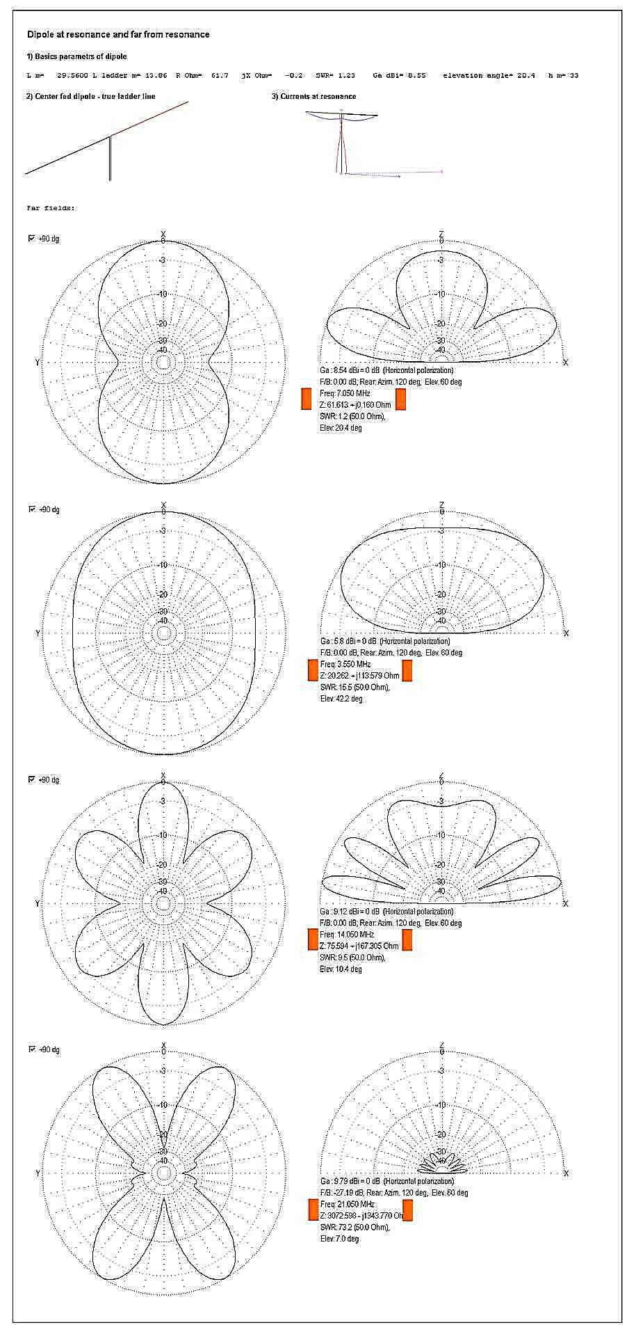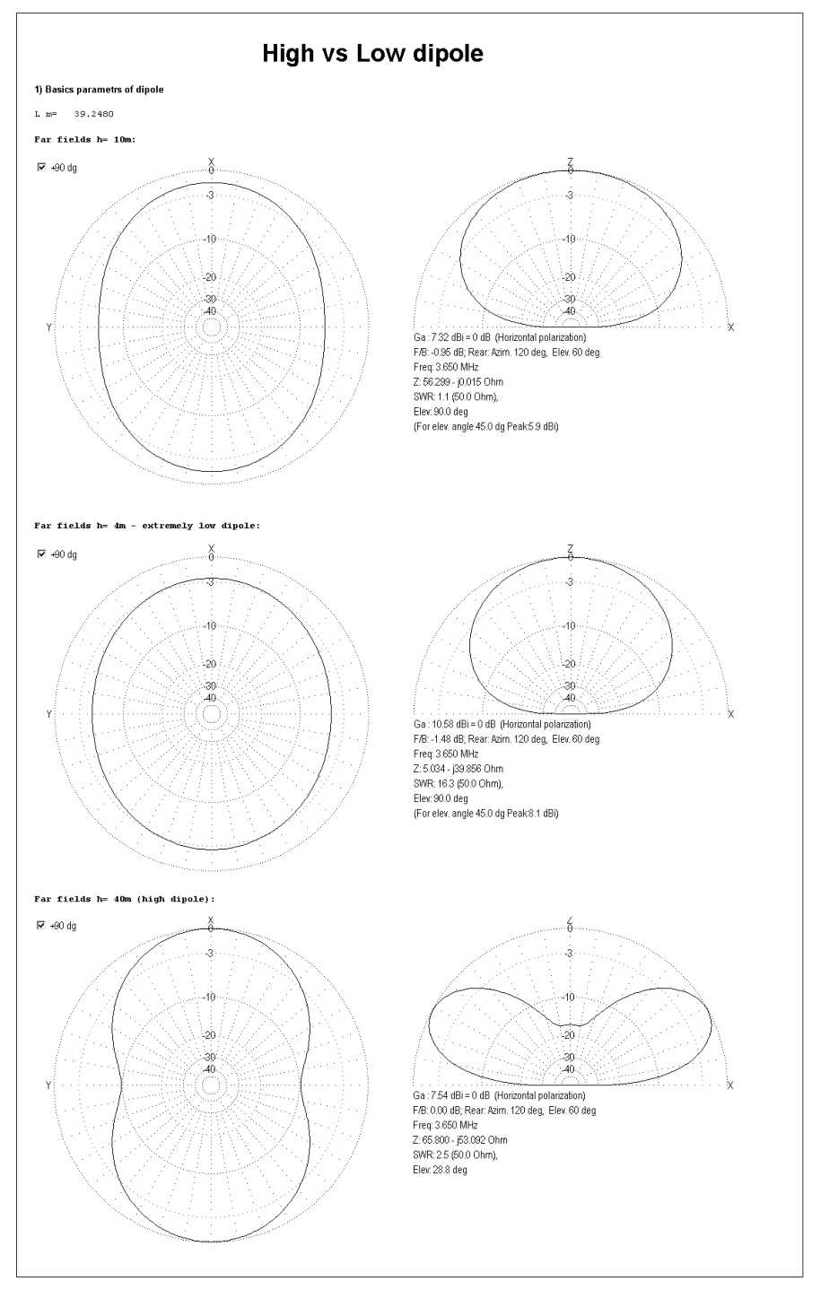 e) Z dalšího obrázku je zřejmé, jaký vliv má na anténu její výška. Reálné země lze u antény využít. Zejména u antén typu Vertical. U dipólů a Delta loopů  zpravidla jen ke konstrukci antén pro místní spojení. Z obrázku je zřejmé, že vysoko instalovaný dipól bude zářit pod nižším úhlem a hodí se pro DX spojení. Nízko instalovaný dipól bude dobře zářit vzhůru a bude se hodit pro místní spojení. Viz též informace v publikaci USMC. Osobně jsem zkoušel a dlouhou dobu používal  nízko instalovaný Delta loop (celovlnný) a dostával jsem reporty, o kterých zde ani nemohu psát. Mnoho dB nad S9. Kolega (OK1CQ) měl dokonce pod takovým Delta loopem ještě jednu parazitní smyčku. A reporty převyšující S9 o mnoho decibelů obdržel i při testu mého QRP zařízení, tedy prokazatelně s 5 W při SSB. Bylo to neuvěřitelné, ale bylo to tak. Nikdy jsem o tom s nikým na pásmu nevedl polemiku a mnoho zkušených radioamatérů to považovalo za fyzikálně nemožné. Příliš nízko instalovaný dipól nebo loop však takové vlastnosti nemá. Bohužel, v nízké výšce nefungují ani směrovky. Dipól směrovek (driven element), pokud je nízko nad zemí, nevybudí správně pasivní prvky a anténa má zcela jiné vyzařovací diagramy. Bohužel, zázračné v tomto nejsou ani antény HB9CV. Antény Yagi, HB9CV i logaritmicko-periodické soustavy dipólů musí být optimalizovány pro konkrétní výšku nad zemí.