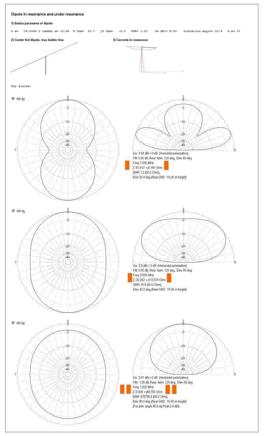 Předchozí text se zaměřoval zejména na minimalizaci ztrát v napáječi, v přechodu napáječe do zářiče a konečně i ve vlastním zářiči. Předpokládejme tedy, že vysokofrekvenční energii nějakým způsobem dostaneme beze ztrát do antény. Je to hodně zjednodušeně řečeno, protože jsem se v textu nevěnoval celé řadě dalších problematik, které souvisí například s přizpůsobením, anténními ladicími členy, baluny a dalším zařízením. Ale o tom bylo napsáno též mnoho vynikajících článků a stručně to popíšu jinde. Skutečností však zůstává, že existují a lze zkonstruovat vynikající vícepásmové antény, které však budou ke své činnosti vyžadovat dobrý nízkoztrátový ladicí člen (transmatch), balun nebo jiné zařízení. Neplatí to jen pro jednoduché drátové antény, ale i pro některé zajímavé směrovky, které vykazují mnohem lepších vlastností než ty, u kterých musel konstruktér udělat mnoho kompromisů najednou (třeba kvůli více pásmům, přizpůsobení k napáječi s postupnou vlnou, geometrickým rozměrům). Ale o tom až u směrovek. Teď jsme u drátových antén a u anténního zářiče a v úvodu jsme si řekli, že anténní zářič drátové antény vyžaduje ke své funkci rezonanci. Na obrázcích jsme si ukázali, co se děje s proudovými a napěťovými špičkami, když je anténa v rezonanci nebo když je krátká či dlouhá. Také už umíme dělat s bezeztrátovým symetrickým žebříčkem a využívat ho tak, aby anténě k rezonanci pomohl. V této části (ale budu se tomu věnovat jinde) jsem se rozhodl odbýt konstrukci transmatche konstatováním, že u symetricky napájených antén preferuji symetrický LC článek, má nejmenší ztráty. Využívám však také automatický nesymetrický LC článek a baluny různých typů. Jde o kompromisní řešení. Tuner mám u TRX, jeden metr koaxiálu vede otvorem v okenním rámu z hamovny ven. Na parapetu okna již je nízkoztrátový balun připojený do napájecího žebříku nebo k LW anténě. Vysokofrekvenční energii však vyzařuje anténní zářič, prvky směrové antény, logaritmicko-periodická řada dipólů či další vodiče kolem antény, které často patří k jinému anténnímu systému. Právě u této problematiky vzniká celá řada mýtů a pověr, které hovoří o tom, že nelze popsat či definovat to, co se děje mezi nebem a zemí. Ale není to tak docela pravda. V dnešní době existuje velké množství relevantních a dobře popsaných zkušeností. Také existuje několik dostupných SW programů, pomocí kterých lze zkoumat, tj. analyzovat a modelovat chování vodičů a antén při vyzařování. Zmíněný SW umožňuje poměrně přesně v grafické podobě prezentovat, co se děje ve vzdálených místech od naší antény. Jsme tedy mimo jiné schopni poměrně přesně simulovat vliv země a předmětů v našem QTH, předpovídat vlastnosti navrhované antény, optimalizovat a modelovat celou řadu parametrů. A tady najednou zjistíme, že navrženou a optimalizovanou mnohopásmovou anténu sice přizpůsobíme na mnoha pásmech, ale pořádně to vysílá jen na jednom pásmu nebo to až tak nevysílá. Setkávám se s radioamatéry, kteří se domnívají, jak skvěle jim anténa chodí, přičemž skutečnost, že na určitých pásmech mají méně hezkých DX nebo jim to nechodí z konkrétních směrů si vysvětlují např. vlastnostmi QTH. Příčinou však také bývají zcela konkrétní tvary vyzařovacích diagramů instalované antény. A u drátových rezonančních antén je třeba s vyzařovacími diagramy účelně pracovat. Co na ně má vliv? Kromě výšky antény nad zemí, směru zavěšení antény mají podstatný vliv vodiče v blízkosti antény, tj. pasivní prvky antény, ale také různé pasivní prvky v obvodech rezonujících zářičů antény.
