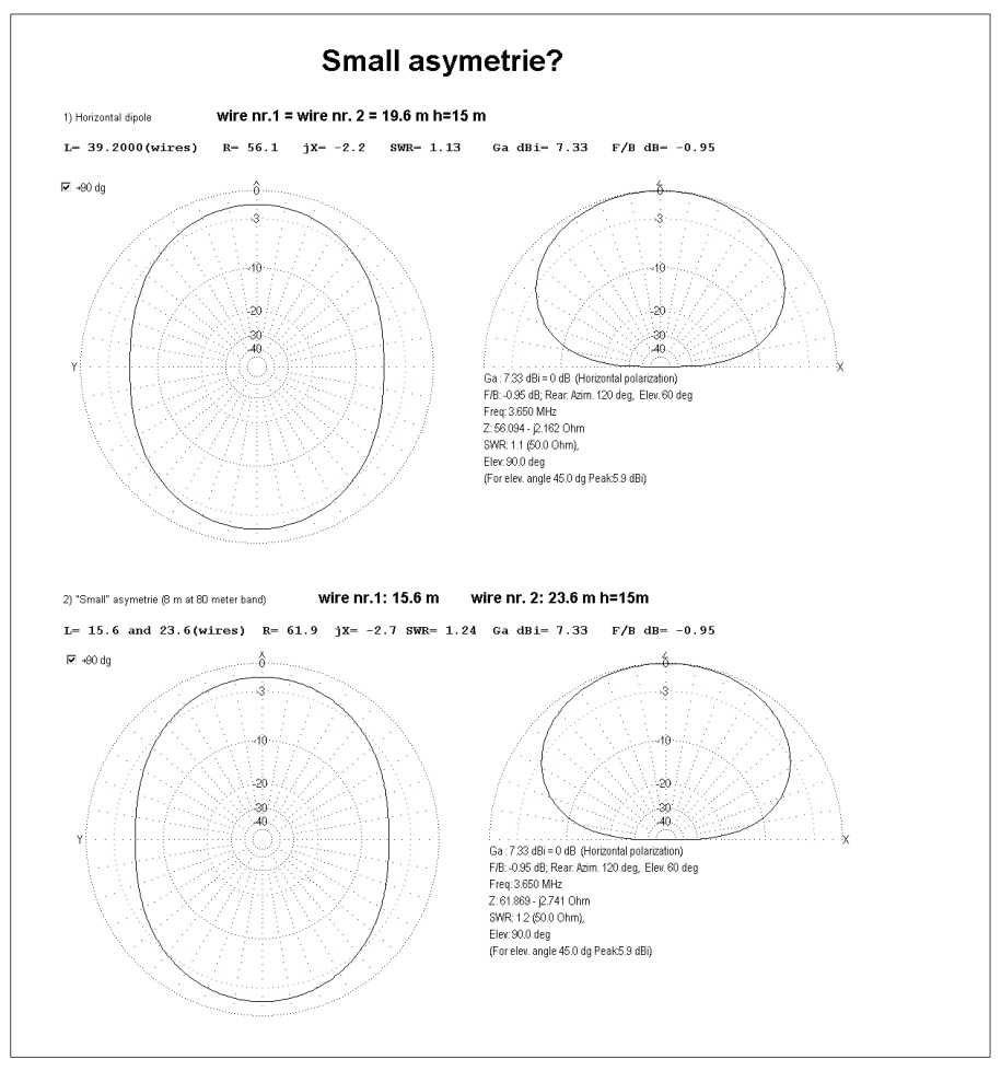 a) Srovnání souměrného a nesouměrného dipólu. Prosím, nezaměnit s dipólem záměrně konstruovaným pro napájení mimo střed (OCD). V případě napájení žebříkem jsem nezjistil podstatného rozdílu, i když se obě ramena dipólu v délce dost lišila. Mýtem tedy zůstává, že přesná symetrie je zásadní. Mě se nepodařilo tento požadavek u napájení žebříkem prokázat: