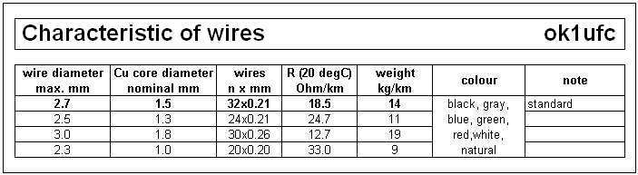 Pro konstrukci drátových antén existuje celá řada více či méně vhodných vodičů. Vyrábějí se speciální anténní lanka, která jsou vyrobená např. z extrémně čisté mědi pro elektrotechnické účely. Některé konstrukce lan využívají mechanicky upravených lan, která byla předem zatížena tahem téměř k hodnotám, při kterých lze měřit kontrakci materiálu, s cílem dosáhnout nízkého tečení (pomalé prodlužování v závislosti na čase při nepříliš velkém mechanickém zatížení tahem) zavěšených vodičů. Měď je však za studena kujný materiál a při mechanickém zatížení vždy teče. Osobně se přikláním k řešení, které anténní lano zbytečně tahem nenamáhá, a to i za cenu, že lano je přiměřeně prověšené. Existují konstrukce lan, které využívají ocelových duší, zlepšujících mechanickou pevnost lan a malé prodlužování zavěšených lan v čase. Antény, které byly předmětem experimentování a vývoje, využívají pro konstrukci zářičů a žebříčků lan s měděnými, lanovanými holými dráty v ochranné trubičce. Používají se lana s 30, 32, 44 nebo 50 vodiči o průměrech drátů 0.21, 0.26 nebo 0.31 mm. Vlastní lano je chráněno trubičkou z UV odolné a stabilizované plastické hmoty. Jmenovitý průměr měděného jádra, např. 1.5, 1.8, 2.2 mm a maximální vnější průměr konkrétního vodiče, např. 2.7, 3.0, 3.6 mm je uváděn u popisu každé antény. Vodiče této konstrukce dostupné na trhu, jsou vyráběné ve velkém množství a ve vynikající kvalitě. Drátové antény v eshopu jsou dodávány s vodiči od jediného konkrétního výrobce, se kterým bylo dohodnuto provedení izolace a podrobnosti mechanického předepnutí jádra. Měď v takto provedené izolaci minimálně chemicky reaguje s okolím a i po delší době zůstává na povrchu kovově čistá. Toto bych však určitě netvrdil o všech anténních vodičích, které se vyskytují na trhu. V roce 2008 jsem experimentoval s vodiči, které byly prezentované jako speciální vodiče ke konstrukci antén a po jednom roce používání byla měď doslova černá. Vlastnosti vodičů: