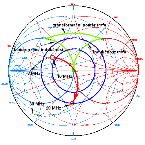 Indukčnost vinutí nám spolehlivě vyjede mimo kruh, kde je VSWR = 3 a