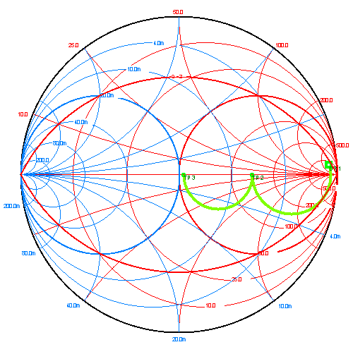 1 a je to na kmitočtu 15 MHz. Uvnitř kruhu s VSWR = 3 jsou body frekvencí