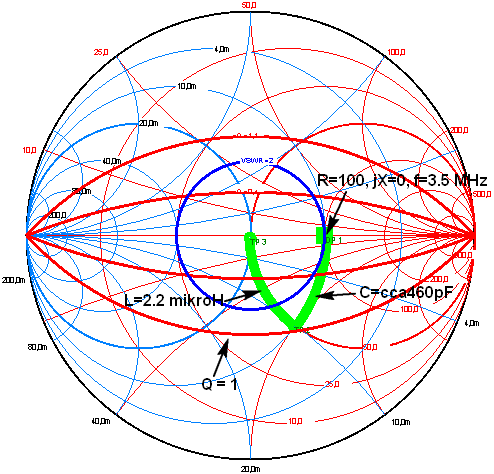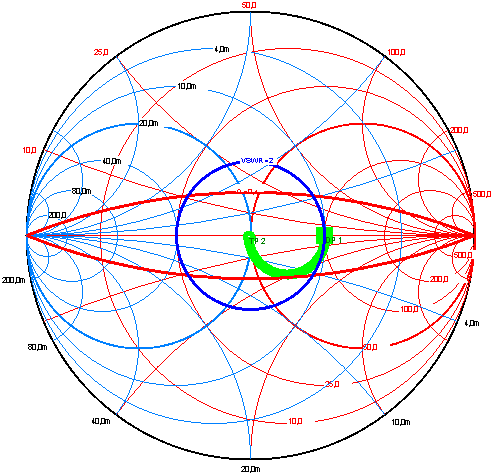 obrázku je zakreslena modře kružnice VSWR = 2.