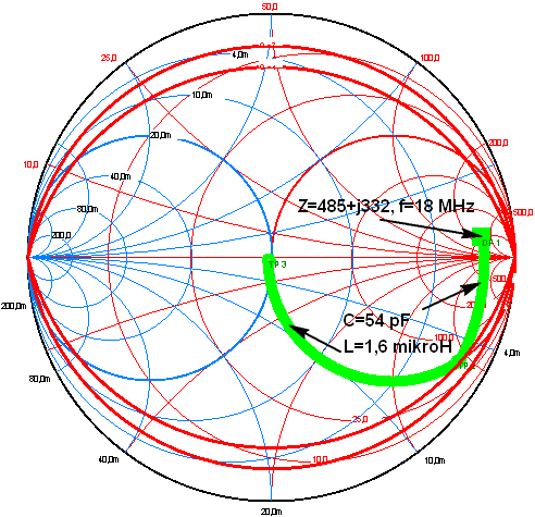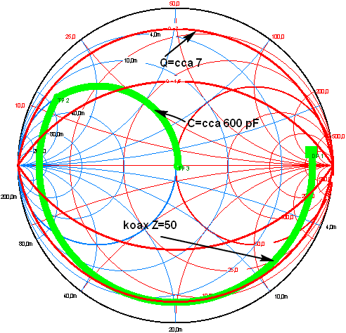 přizpůsobíme kapacitou 460 pF a indukčností 2,2 mikrohenry. Vidíme, že