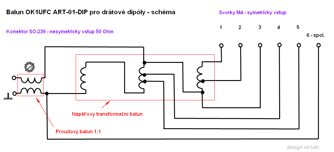 Můj balun (občas ho prodává manželka v e-shopu) má dvě části zhotovené na dvou lehkých feritových jádrech. Na schématu vlevo je na samostatném jádře obyčejný širokopásmový proudový balun s transformačním poměrem 1:1. Ten je tam proto, aby nás zbavil plášťových proudů, tedy aby symetrizoval souosý koaxiální napáječ vůči zemi a symetrickým ramenům dipólu. Na schématu uprostřed je napěťový vf transformátor. Je navržen tak, aby na odbočkách 1, 2, až 5 byly vyvedeny vstupy, které odpovídají přibližně reálným složkám impedance R = 100, 70, 50, 35 a 25 Ohmů. Svorka č. 6 je společná a připojuje se na ni druhé rameno dipólu. V předchozím Smithově diagramu tomu odpovídají body DP1, DP2 až DP5. Pro přizpůsobení, kde VSWR nepřeleze hodnotu 1.4 jsem vystačil celkem s 5 vyvedenými odbočkami. U FAN dipólu jednotlivé dipóly nepřepínám. Každý je připojen na odpovídající odbočku. Závěr Vidíte, že i dipól lze přizpůsobovat různě. Zejména, pokud ho zkracujete, děláte z něho INV-V, montujete ho nízko a nebo ho řadíte paralelně. O zkracování dipólu je tento článek, o rezonanci dipólu je tento článek, o úskalí, které se nám může stát u FAN dipólu je tento článek, o dipólech obecně je tento článek a o konstrukci drátových ham antén je tento můj první článek. Poznámky Transformační blok se dvěma baluny je v praxi běžný. Proudový a transformační balun se používá také u OCF antén včetně vertikálů. V boxu ho najdete např. u známé AV-640 (Hy-Gain). Pro FAN dipóly je však navržen tak, aby pokrýval i hodnoty nižších impedancí, pro ještě použitelné malé výšky a přiměřená zkrácení jsem posadil spodní hodnotu R na cca 25 Ohmů, teoreticky lze vyvést ještě 12.5 Ohmu, ale bez praktického upotřebení. |