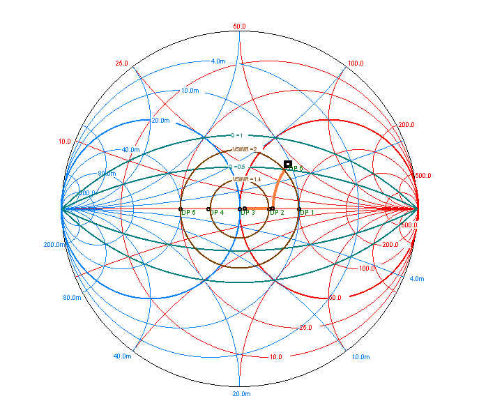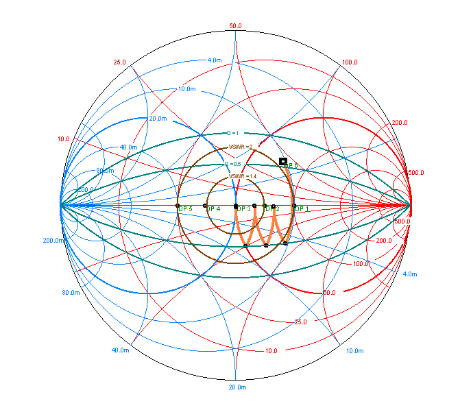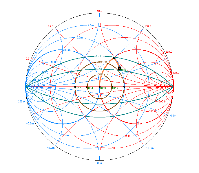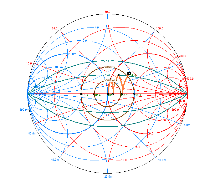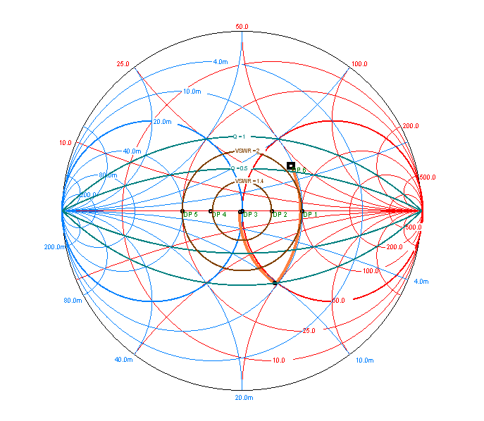 Podotýkám, že jsem v praxi neviděl nikoho, kdo by to takto na krátkých vlnách u antén řešil, snad s jedinou výjimkou a to jsou některé tunery, zpravidla mechanické, levnějšího provedení a s malými kapacitami otočných kondenzátorů. Takové tunery toho moc nevyladí a tak se jim někdy trochu pomůže kaskádně předřazeným L článkem. U dipólů napájených uprostřed je to však nesmyslné řešení. Hodnoty R, kterých mohou nabývat u FAN dipólu jednotlivé dipóly v různých výškách Jak jsem již napsal, může to vadit v případě, že některé dipóly jsou již nízko vzhledem ke své vlnové délce nebo je musíme s ohledem na rozměry pozemku prodlužovat indukčností. Opět předpokládáme, že jalovou složku jX jsme nastavili na nulu štípačkami (nebo těmi indukčnostmi, pokud zkracujeme). Zakreslíme si situaci do Smithova diagramu: