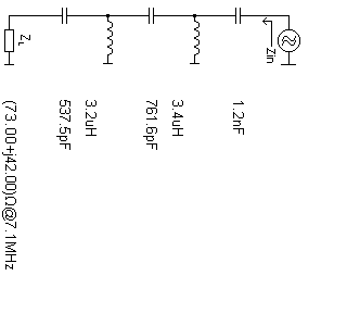 V grafu je uvedena reálná složka impedance až do výšek h = 10 x lambda (černá čára). Všimněte si, že nejvíce se R mění při výškách do cca 1 x lambda, a to přibližně od 20 Ohmů do 100 Ohmů. S výškou se samozřejmě mění významně i jalová složka impedance (červená čára), tu v běžné krátkovlnné praxi kompenzujeme "štípačkami", obvykle si to můžeme dovolit, protože zisk se příliš nezmění. Zisk se u dipólu s výškou také mění, nikoliv však výrazně. Velice výrazně se však mění maximum vyzařování nad horizontem. Ramena dipólu bývají obvykle symetrická vůči zemi, ale napájení realizované koaxiálním kabelem bývá nesymetrické. Víme, co např. nesymetrie u antény dovede, pokud nepoužijeme balun. Poznáme to obvykle na poslechu, projevuje se to vysokou úrovní hluhů. Po připojení balunu, který nám vyrovná plášťové proudy přijímač obvykle ztichne, sníží se S/N. Pokud máme dostatečnou výšku antény, abychom právě nepracovali s nízkou reálnou hodnotou R, tak v tomto okamžiku obvykle považujeme montáž za dokončenou a můžeme začít vysílat. Pokud máme náhodou imedanci vyšší a můžeme při montáži INV-V měnit výšku krajních bodů, vyjde nám impedance takové antény poblíž hodnoty R = 50 Ohmů a také není nadále potřeba nic řešit. Dipóly pro více pásem Jiná situace nastane, pokud potřebujeme dipól vícepásmový. Velice oblíbené jsou paralelně řazené dipóly. Takové anténě se říká FAN dipole. Antény mají výhodu v tom, že pokud jsou dobře zkonstruované, bývají většinou dobře přizpůsobené a po přepnutí pásma jsou okamžitě připravené k práci. Není třeba nic přepínat a ani polovodičový lineár se nám při přechodu z jednoho pásma na jiné jen tak snadno nezničí. Úskalí může nastat, pokud paralelně k jednomu koaxiálu řadíme dipóly, které mají s ohledem k vlnové délce různou výšku nad zemí. Potom má např. dipól pro 80 metrů R = 30 Ohmů, dipól pro 20 m má R=50 Ohmů, dipól pro pásmo 40 metrů má R = 90 Ohmů a dipól pro 15m má R = 70 Ohmů ....Přičemž předpokládám, že jX jsme štípačkami "doladili" na jX = 0. Co s tím? Můžeme vyšší VSWR samozřejmě dolaďovat tunerem přímo u antény. Dělají se krásné malé outdoorové tunery a toto zvládnou. Nebo se můžeme smířit s tím, že si u antény, která na některých pásmech vysílá vysoko a hodí se jen pro místní spojení přizpůsobíme VSWR tunerem u TRXu, zvýšíme si další ztráty v napáječi a vzdáme se možnosti dělat DX spojení. A nebo se podíváme, co se s tím dá dělat. Smithův diagram Ve Smithově diagramu lze snadno řešit přizpůsobení u dipólu. Pokud tedy nemáme naše FAN dipóly na štíhlém laminátovém stožárku, který už toho mnoho mechanicky neunese, určitě se nám povede vyřešit L článek, který dáme ke každému dipólu. Na dalších obrázcích uvádím do Smithova diagramu zakreslený náš dipól v rezonanci, tj. bod Z = 73 + j 42. Ve Smithově diagramu jsem zakreslil ještě toto: střed s hodnotou Z = 50 + j0, kružnici s VSWR = 2 (náš dipól má VSWR = cca 2.16) a dvě kružnice - Q = 1 a Q = 0.5. Tyto kružnice se používají pro návrh LC článků a platí, že čím je nižší Q, tím jsou menší ztráty. Pokud použijeme jednoduché L články, lze použít jak dolní či horní propust, vypadá to v diagramech takto. L a C jsou tlusté červené čáry: