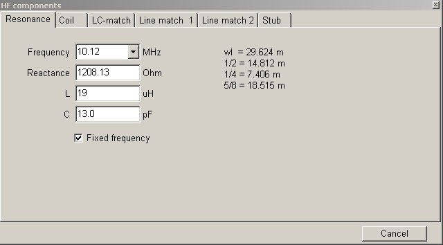 Poznámka: Na obrázcích vpravo je orientační výpočet potřebných kapacit pomocí kalkulačky pro výpočet HF komponentů, která je součástí programu MMANA (v menu ji najdete jako HF components).