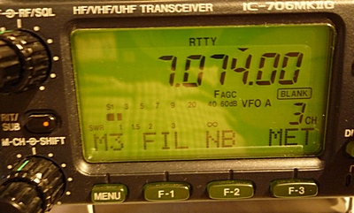 3. Přesné naladění jsem prováděl pomocí vysílače TRXu. Nastavil jsem výkon cca 20 Wattů, provoz RTTY (nebo FM), aby rádio vysílalo při klíčování PTT tlačítekm a naladil jsem nejlepší VSWR pomocí vestavěného indikátoru TRXu - viz fotka displeje vpravo (VSWR je minimální, kmitočet 7074 kHz, mód RTTY).